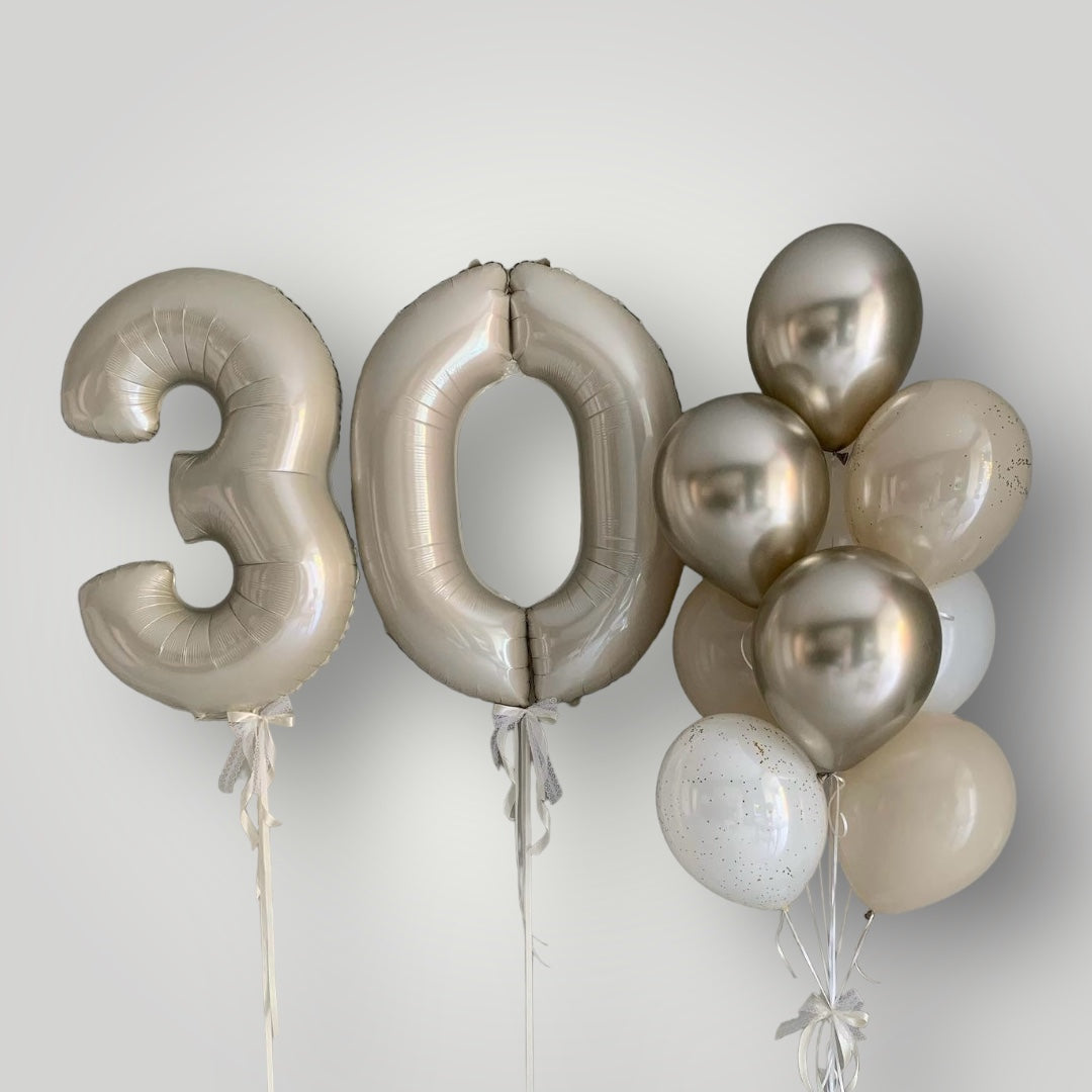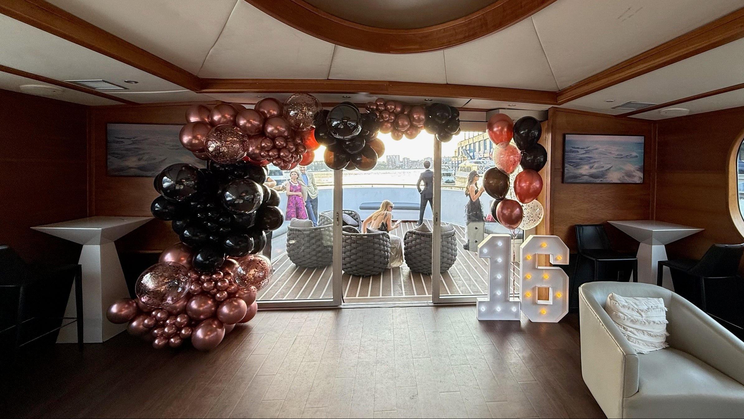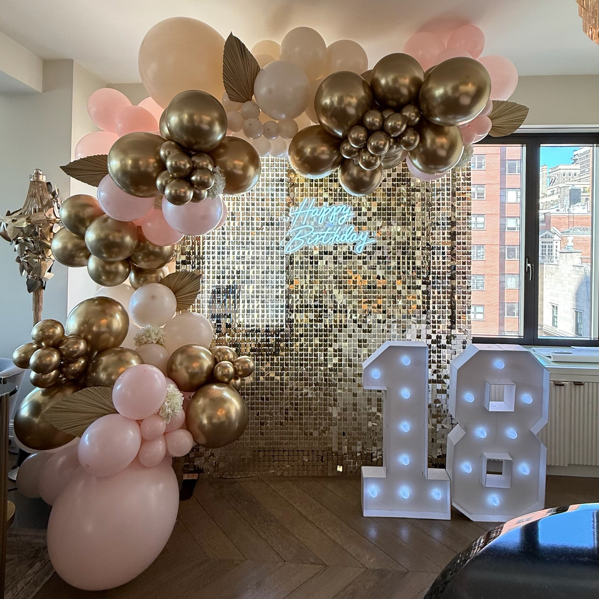 Add-ons: personalized text or LED sign, marquee numbers, optional mylar balloons, florals, or themed cutouts