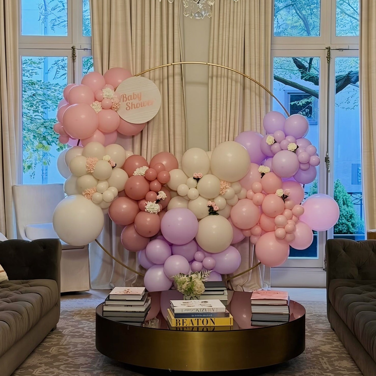 Organic balloon garland attached to a circular base is a beautiful way to enhance any space.