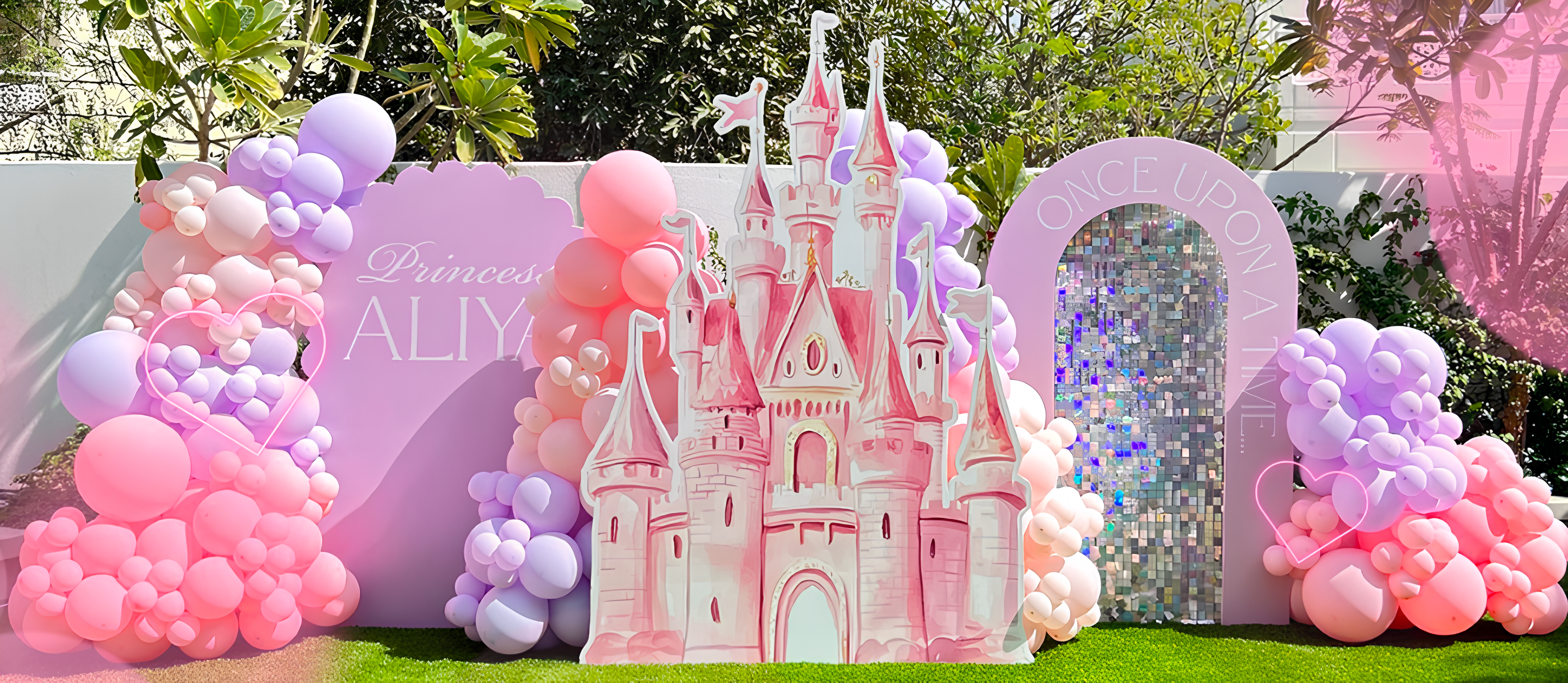 - Add-ons like LED signs, florals, mylar elements, cutouts, or props