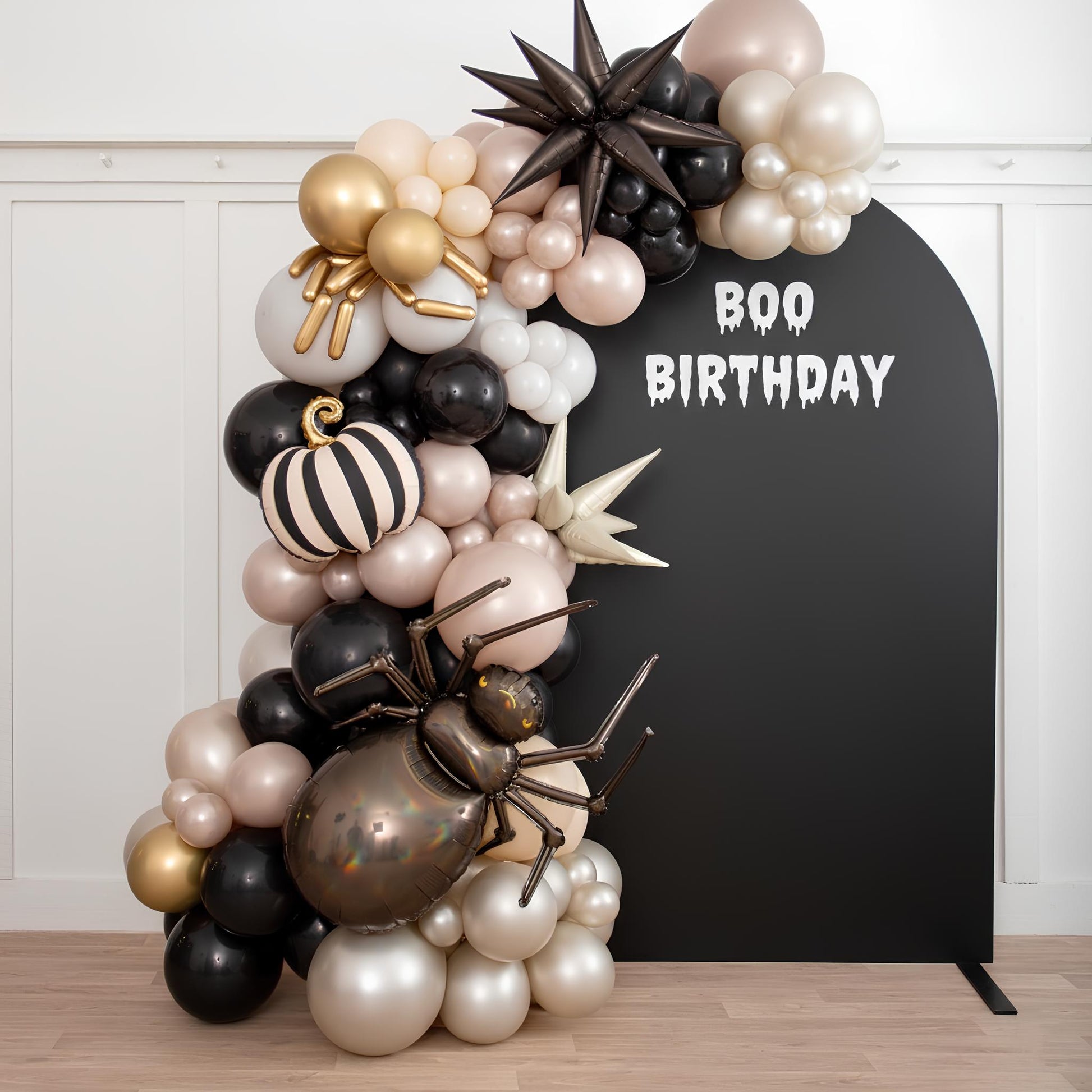Turn your event into a hauntingly elegant scene with the Black Widow Backdrop, featuring a luxurious blend of black, gold, and champagne balloons. Decorated with striking metallic spiders, striped pumpkins, and spiky starburst accents, this design perfectly balances eerie sophistication with Halloween flair.