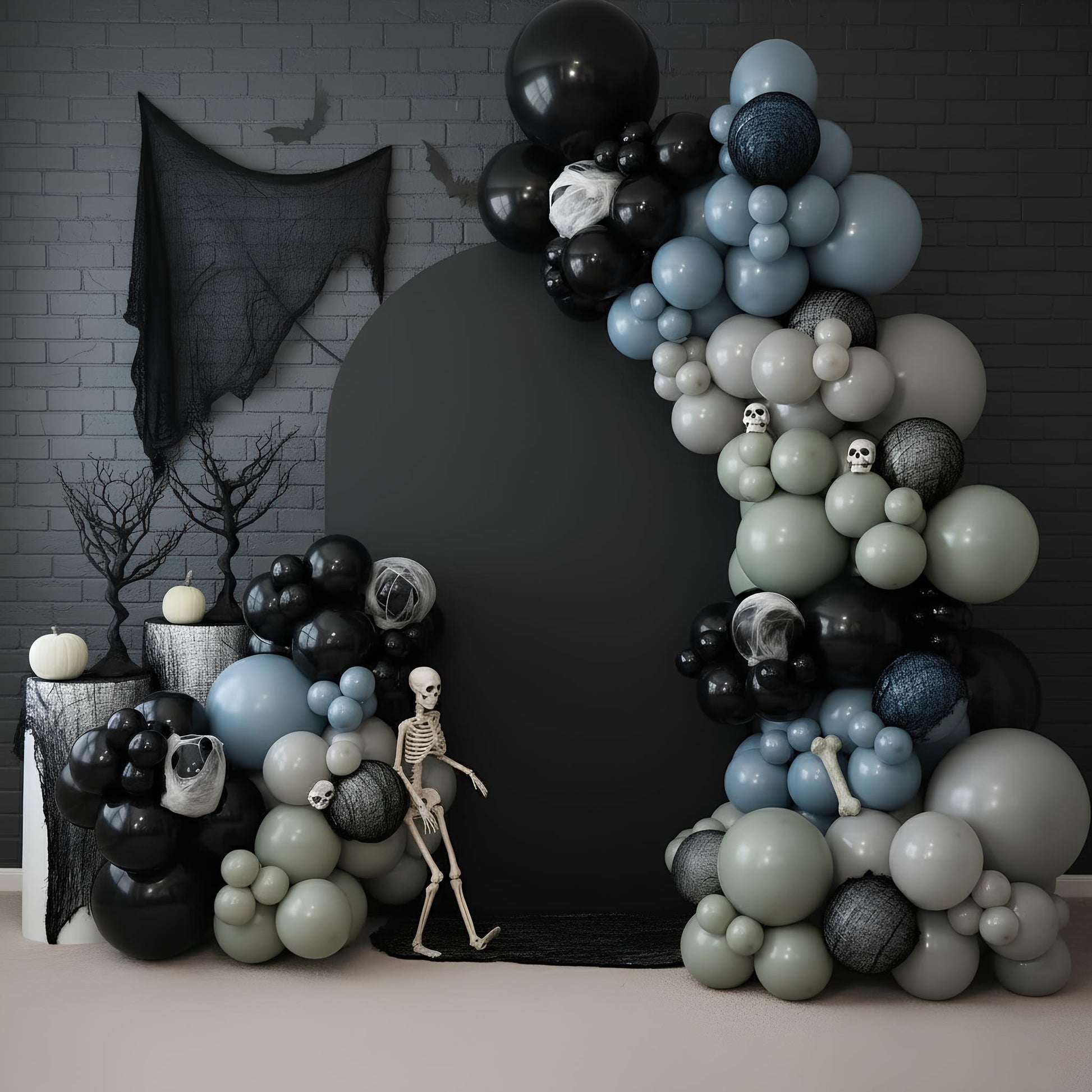 Bring an air of dark sophistication to your Halloween celebration with the Eternal Night Backdrop, featuring a haunting mix of black, smoky gray, sage, and midnight blue balloons. Accented with skulls, cobwebs, and bone details, this design creates the perfect eerie-yet-elegant atmosphere for parties, themed birthdays, or photo moments.