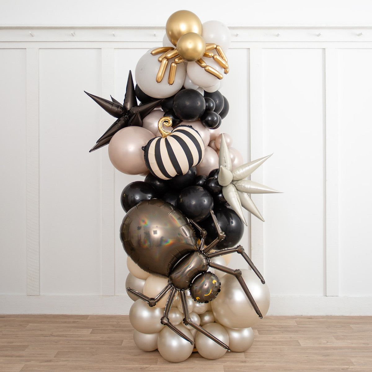 Make a bold statement with the Golden Web Column, a 7-foot-tall Halloween balloon display that combines luxury and spooky charm. Designed with a striking mix of black, gold, champagne, and nude tones, this column features metallic spider and pumpkin balloons, along with starburst accents that add a modern and elegant touch.