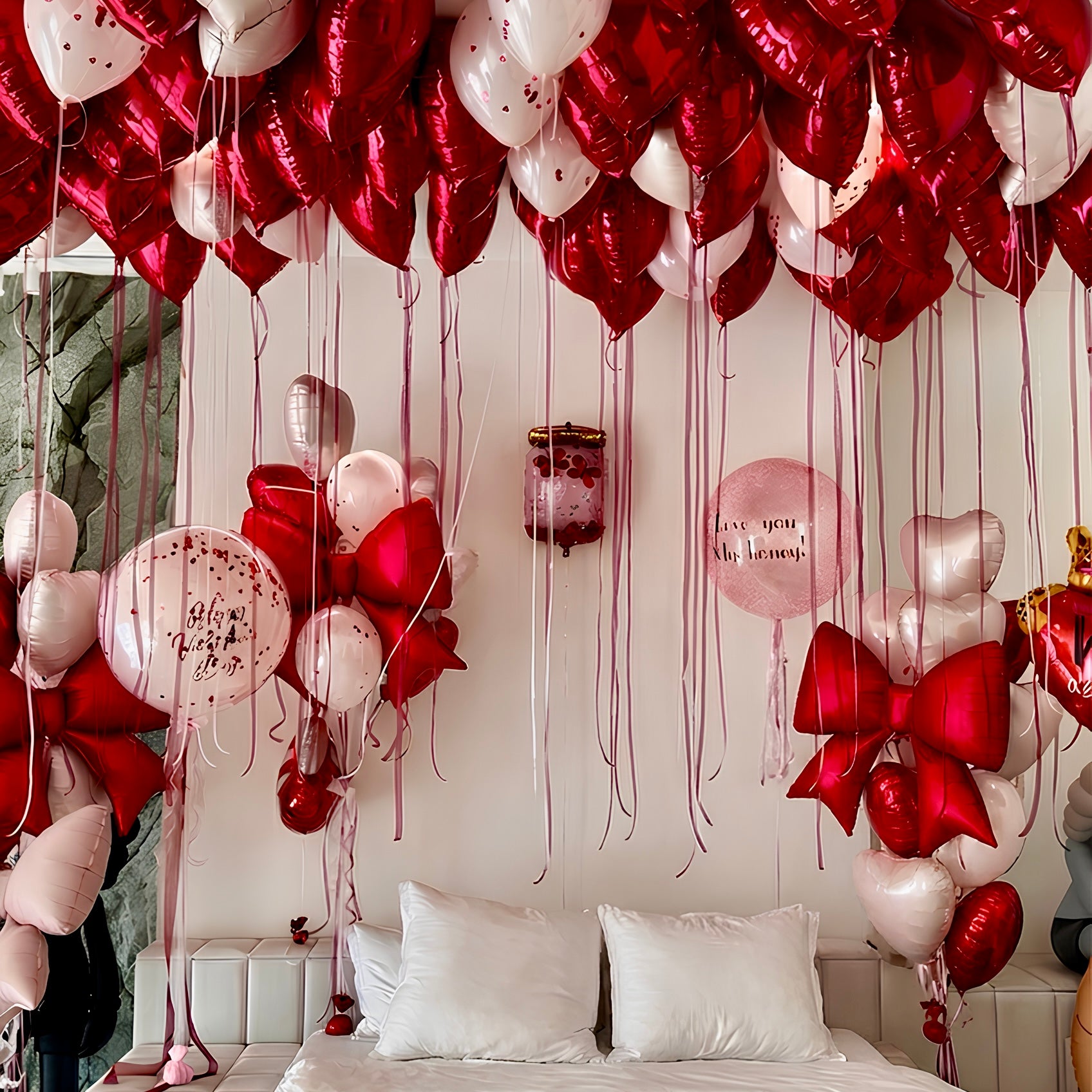 Romantic ceiling balloon décor with red and white hearts, cascading ribbons, and confetti accents — perfect for Valentine’s Day or anniversaries.