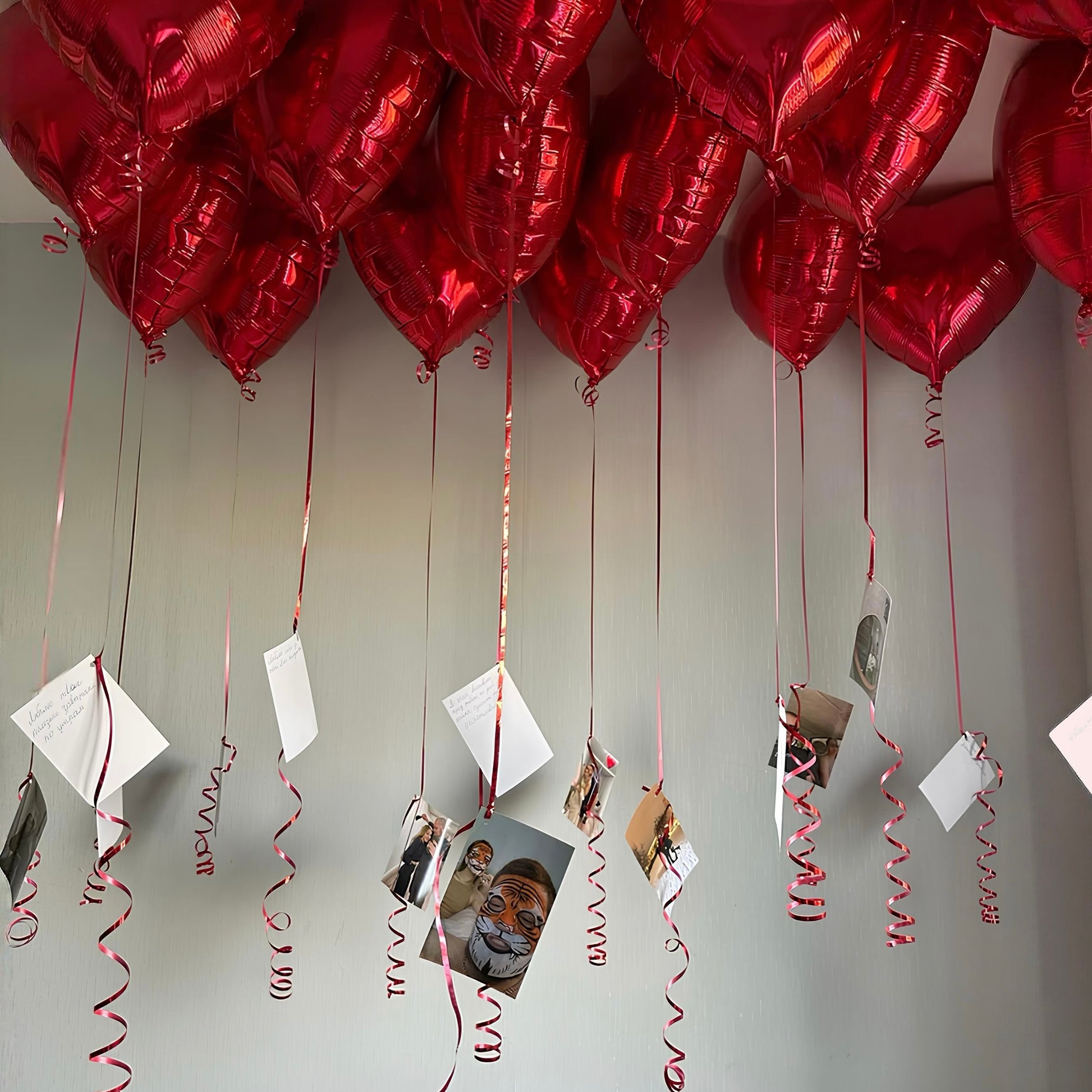 A romantic ceiling installation of red heart balloons with cascading ribbons, each holding printed photos of your favorite moments together. A deeply personal setup that transforms your space into a floating gallery of memories.