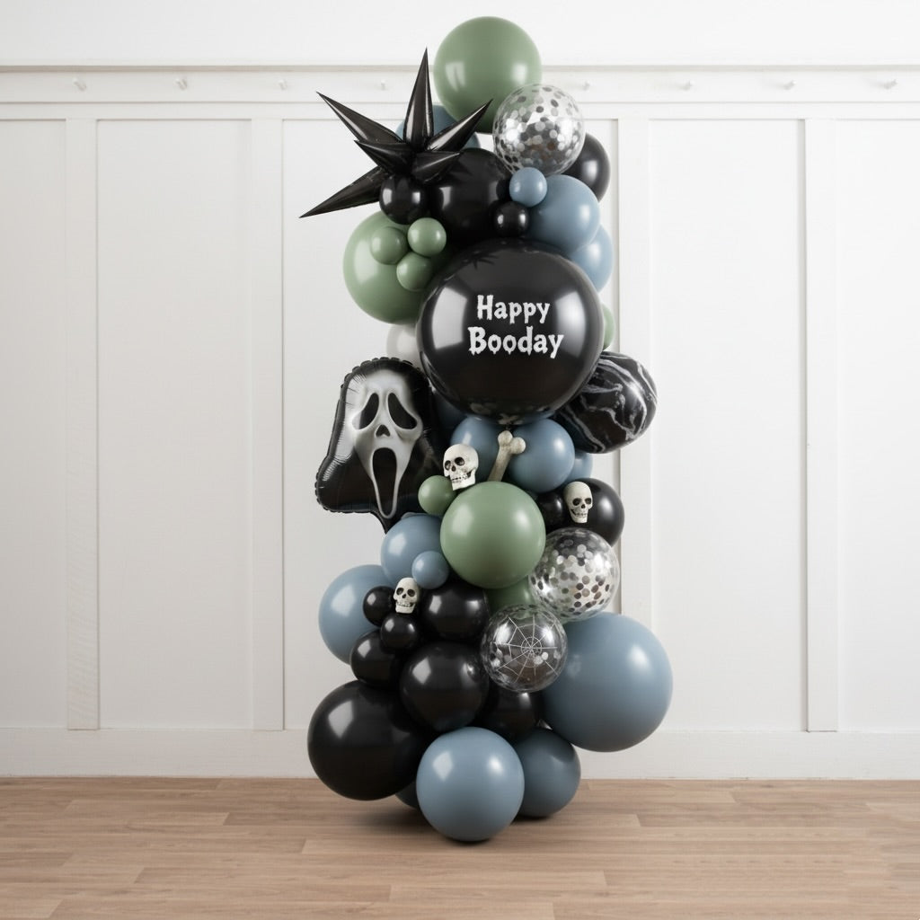Add a chillingly elegant touch to your celebration with the Wicked Fog Column, a 7-foot-tall balloon arrangement in moody shades of sage, smoke blue, black, and silver. Decorated with ghost-face foil balloons, skull accents, metallic spikes, and spiderweb details, this design strikes the perfect balance between spooky and sophisticated.